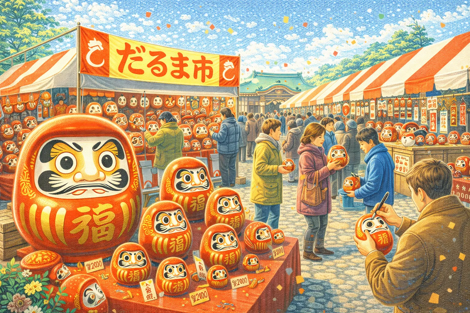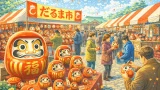 だるまや縁起物が並ぶ新年らしい雰囲気は、一年のスタートにぴったりです。