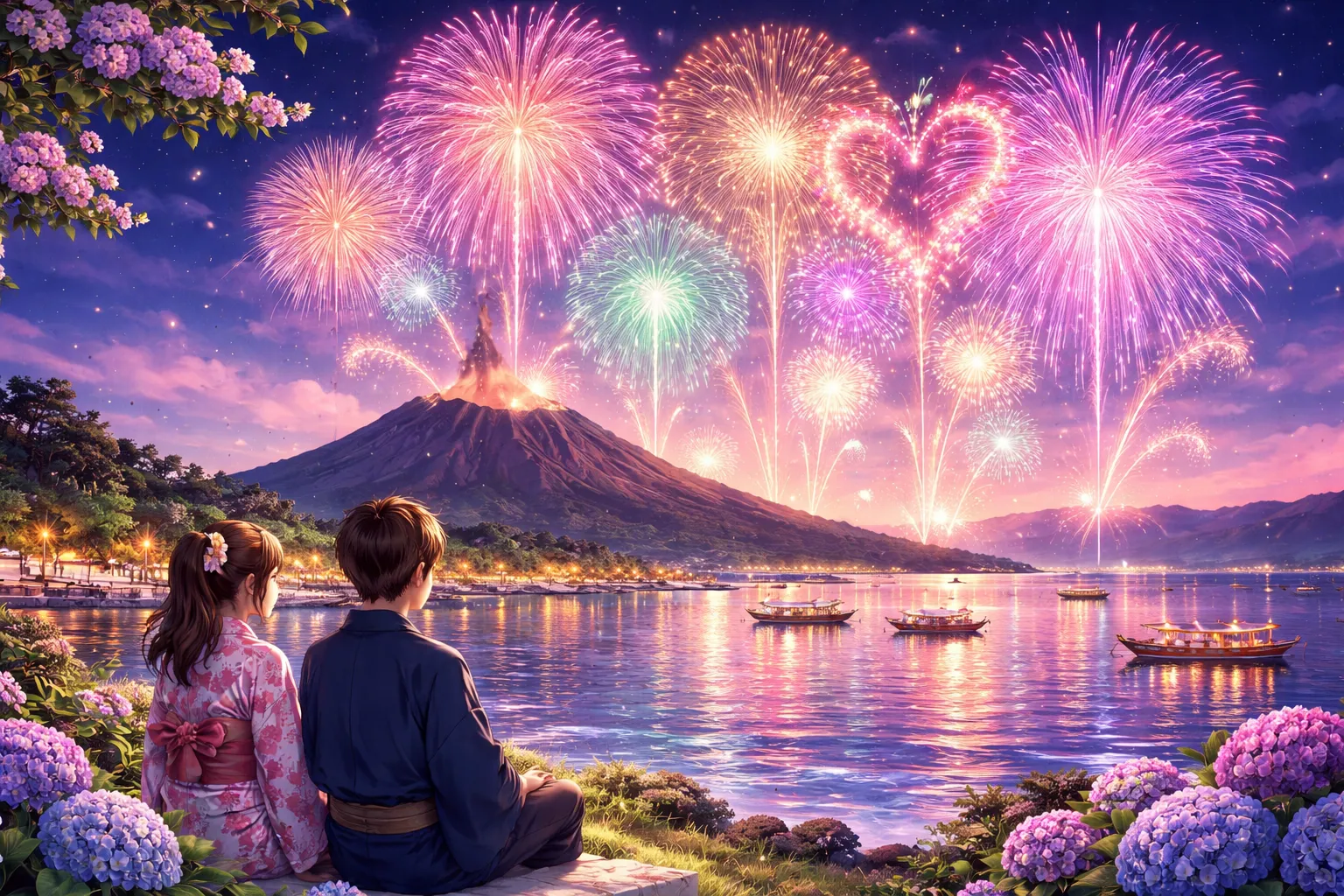 桜島と錦江湾を背景に、音楽と完全にシンクロした芸術花火が打ち上がるこのイベントは、全国でもトップクラスの人気を誇る花火大会のひとつです。